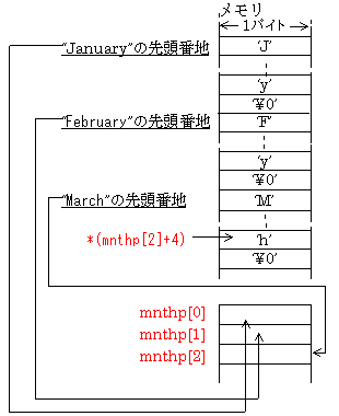 普通ポインタを用いるときには、配列などのアドレスをポインタに設定して用いますが、 文字列の場合には、配列を使わずにメモリ上に取られた文字列リテラルのアドレスを直接ポインタに指定することができます。