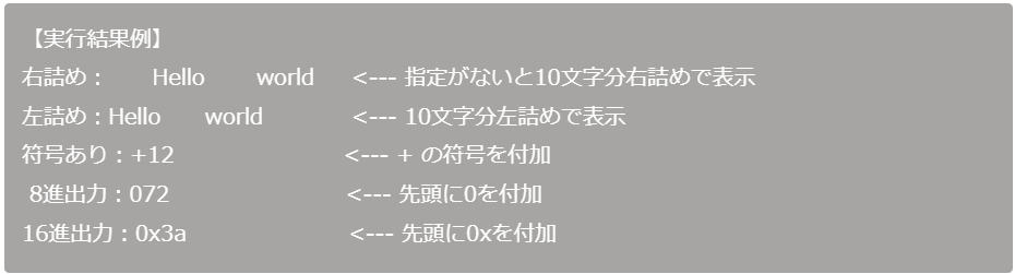 printf("左詰め:%-10s%-10s\n", str1, str2);