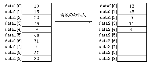 この配列を順に調べ、奇数の値のみ、別の大きさ10の整数型配列に代入しなさい。